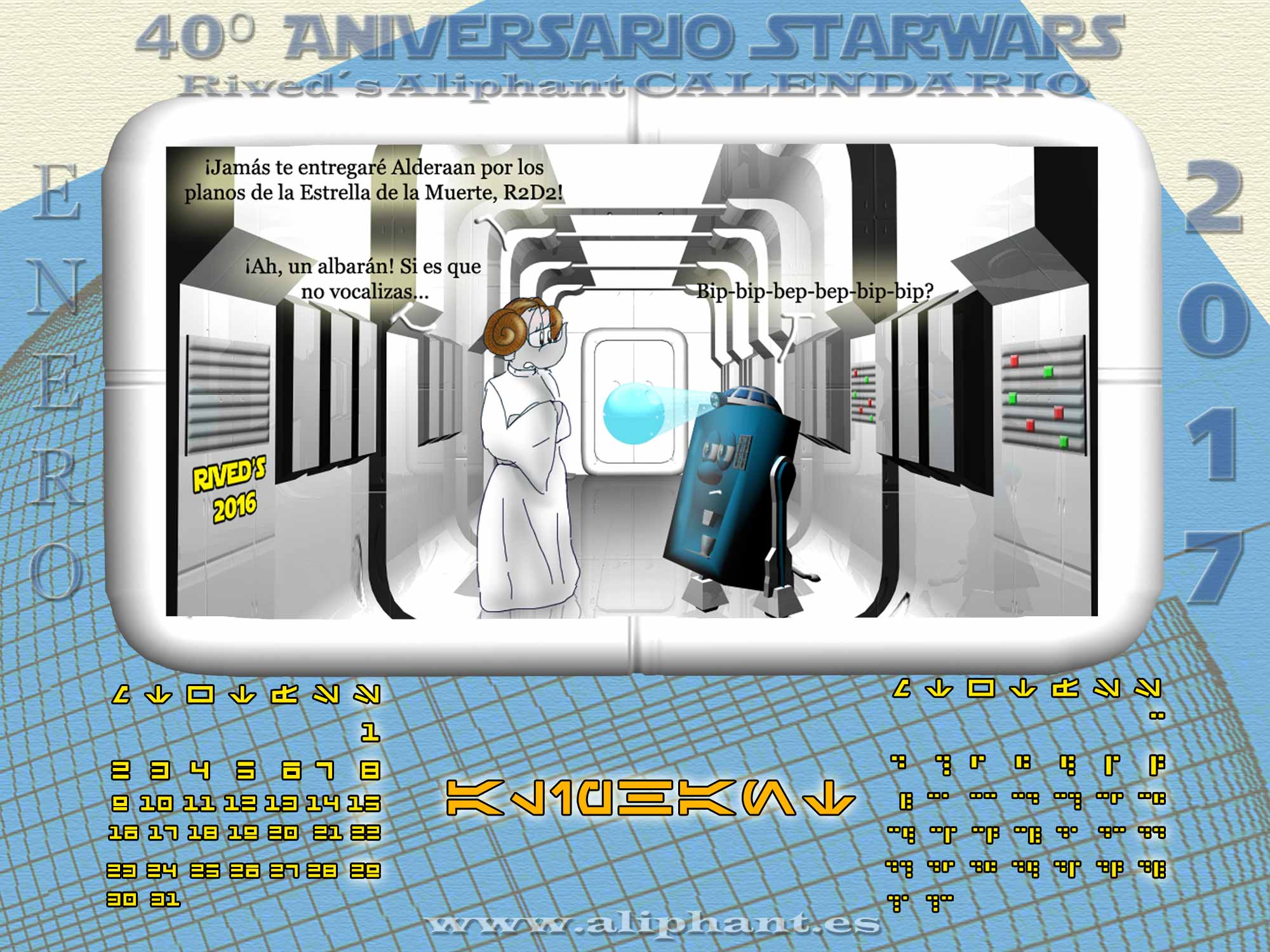 Doble calendario, en Aurek-besh a la izquierda y con los números tech a la derecha. Los domingos son luminosos. Las iniciales de los días de la semana están en Basic, de Monday a Sunday.