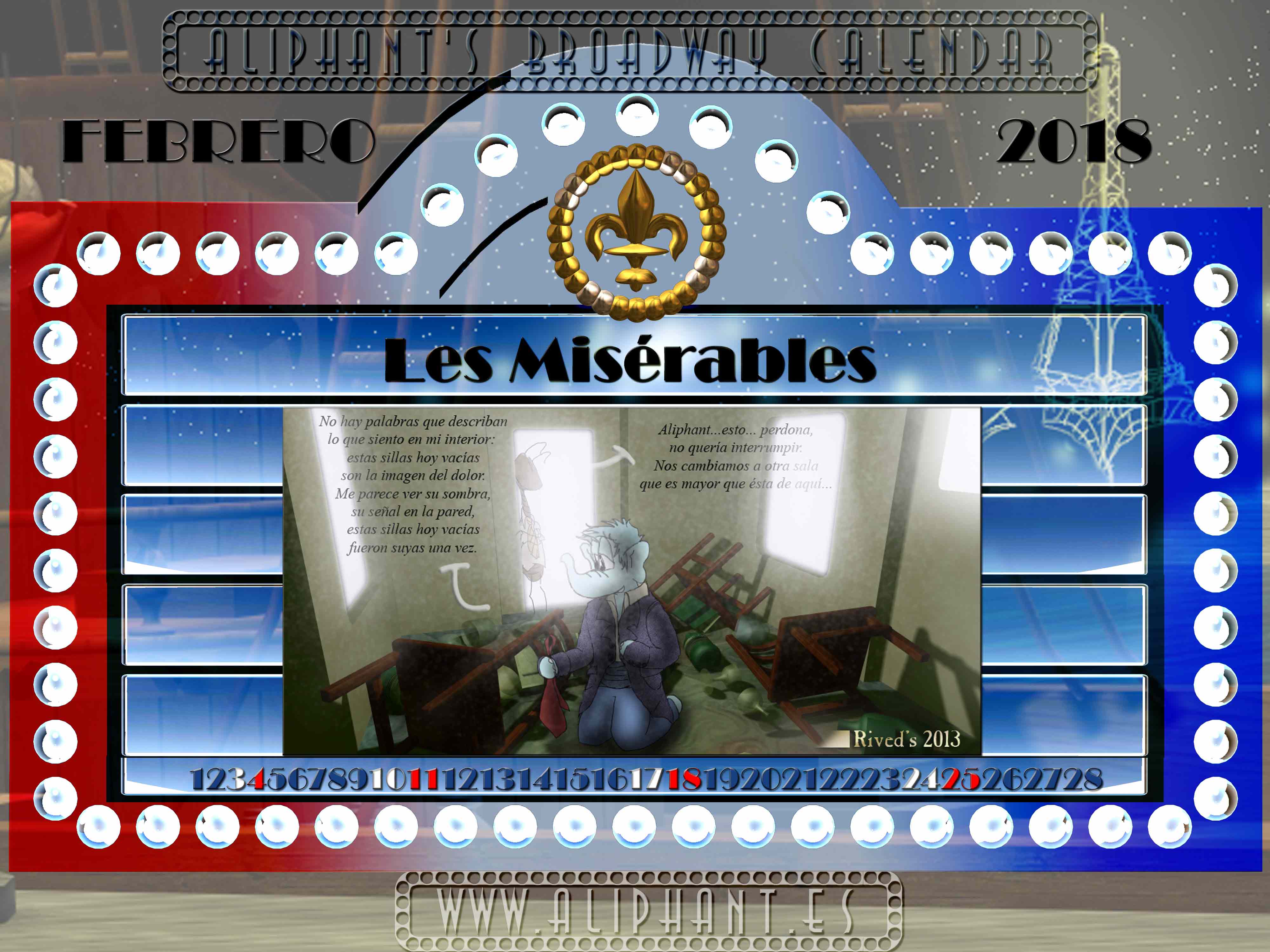 Doble calendario, en la banda inferior con los sábados en blanco y los domingos en rojo. En el escudo de la flor de lis, los fines de semana en plata y la punta de la figura señala en inicio del mes.