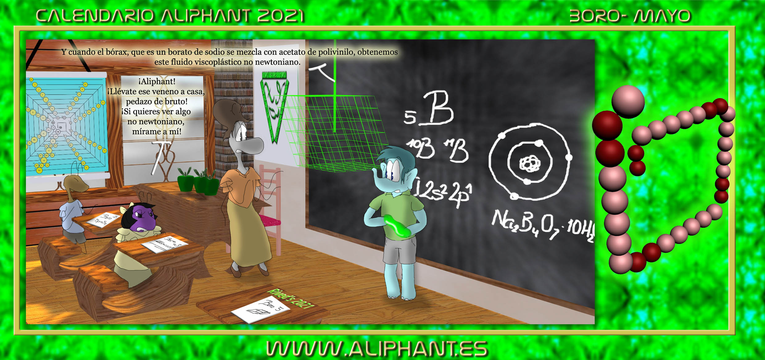 Al estilo de la tabla periódica piramidal, una espiral cuadrada que empieza en el interior, cambia de dirección por semanas y viene con sábados y domingos en otro color.