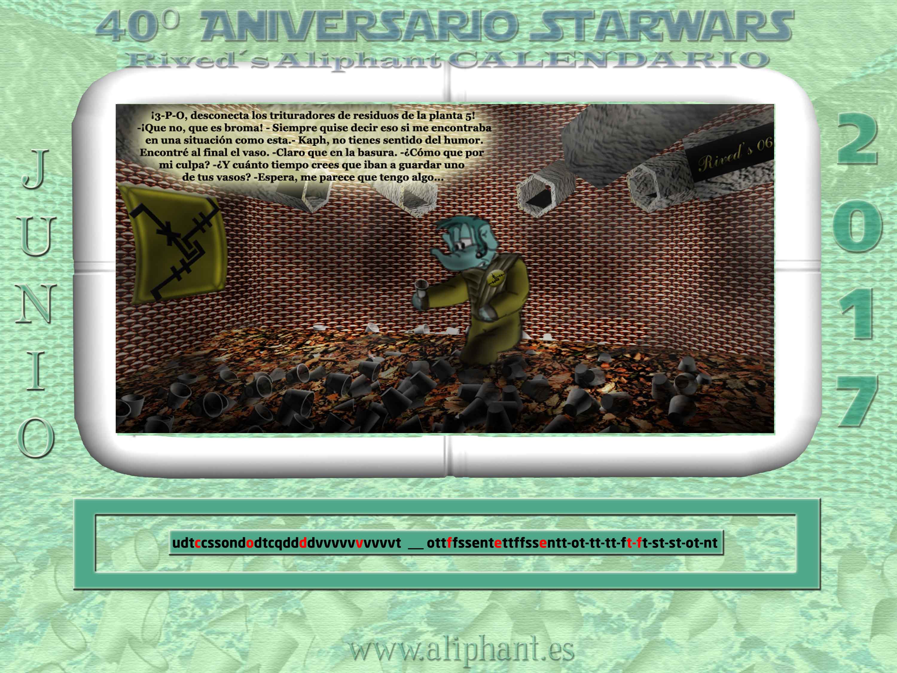 Calendario en dos idiomas, primero en castellano, con los números del mes por su primera letra, domingos en rojos y a continuación, el mismo procedimiento, pero en la lengua de George Lucas.